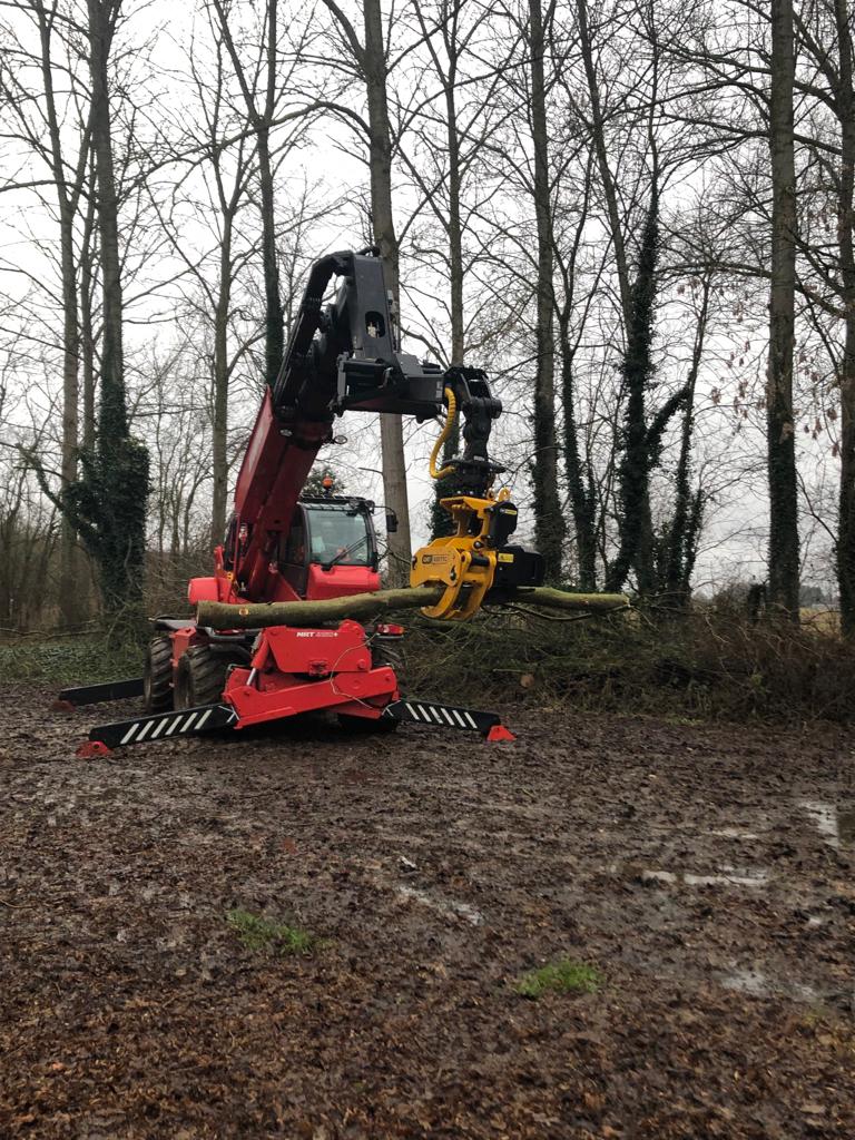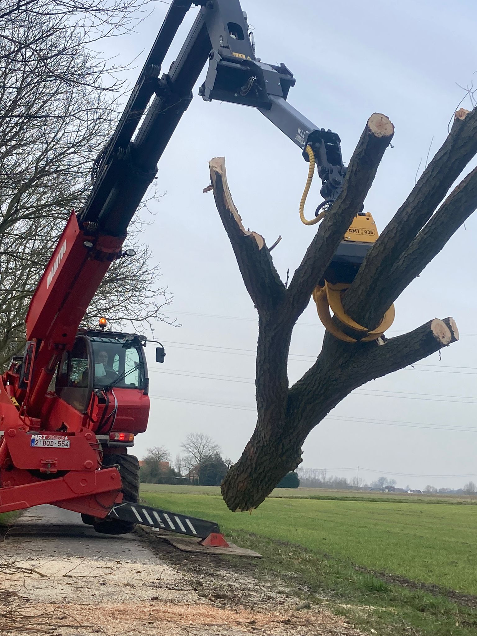 Een hoge boom vellen… Overhangende takken snoeien op moeilijk bereikbare plaatsen… Wij staan klaar voor u met behulp van een ROTERENDE VERREIKER MET VELKOP die takken van op een afstand afzaagt en vastklemt.