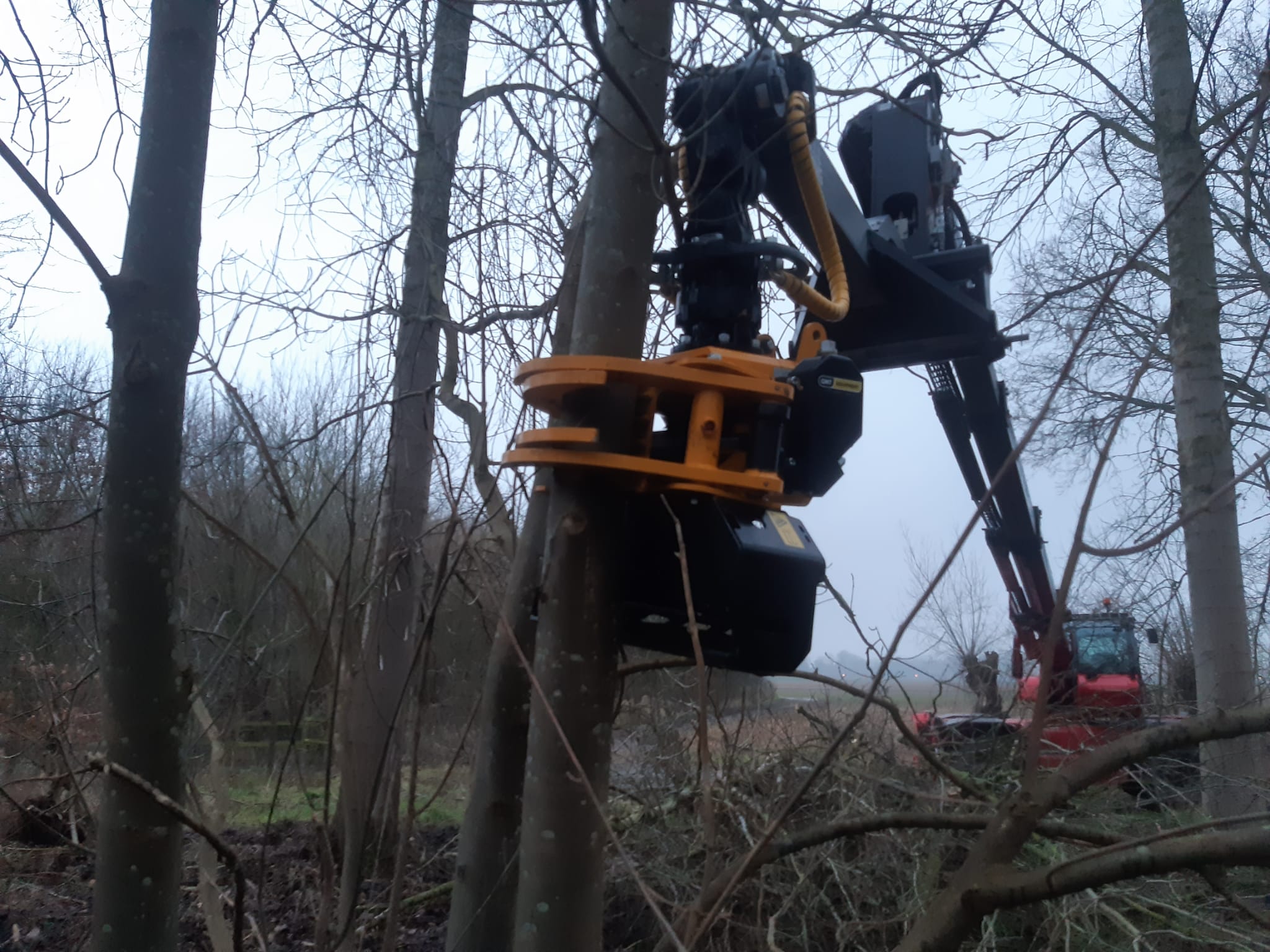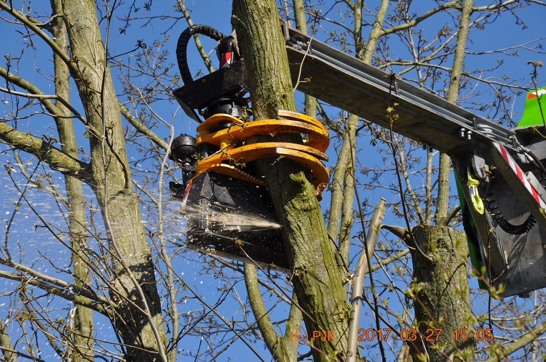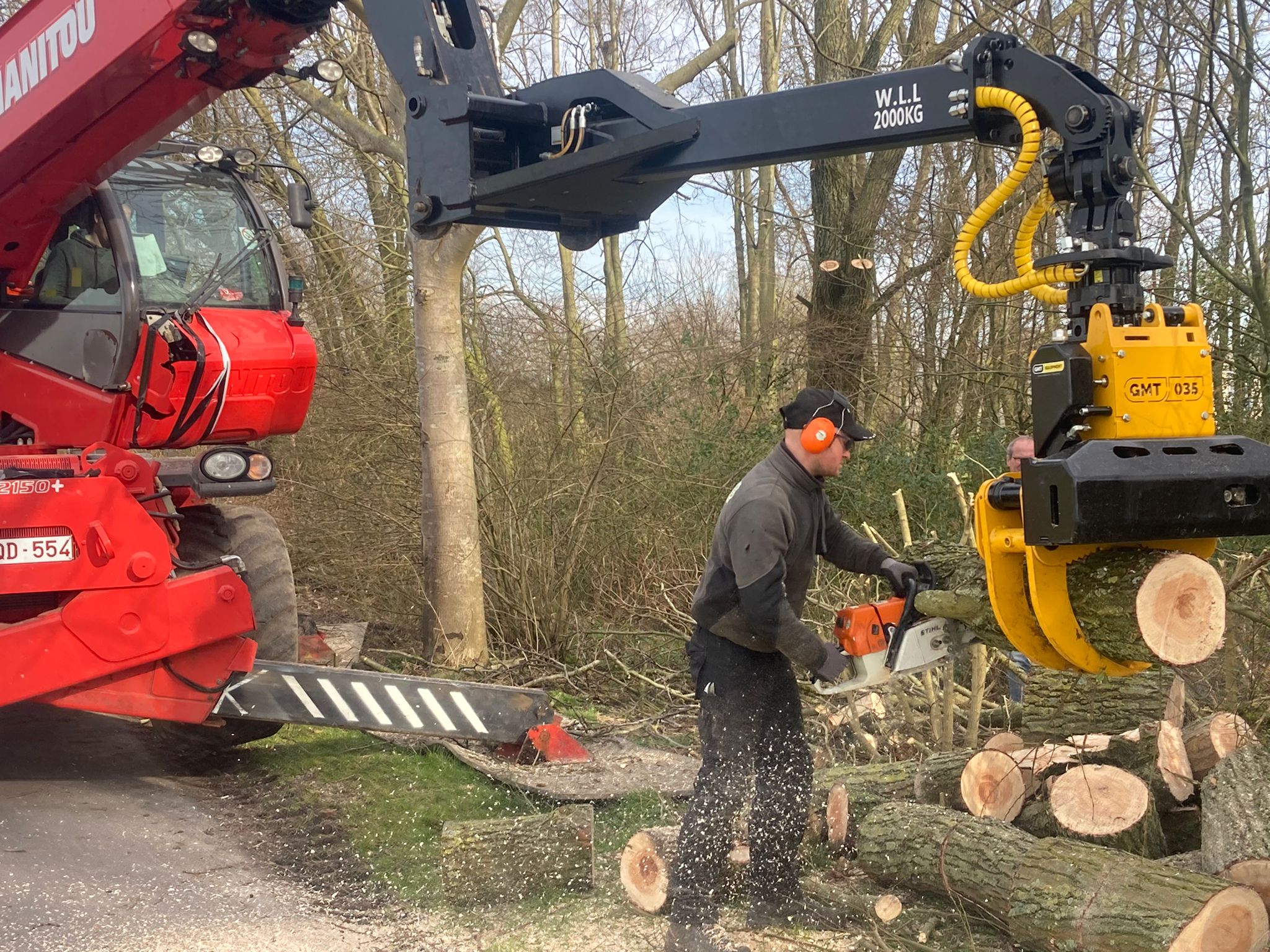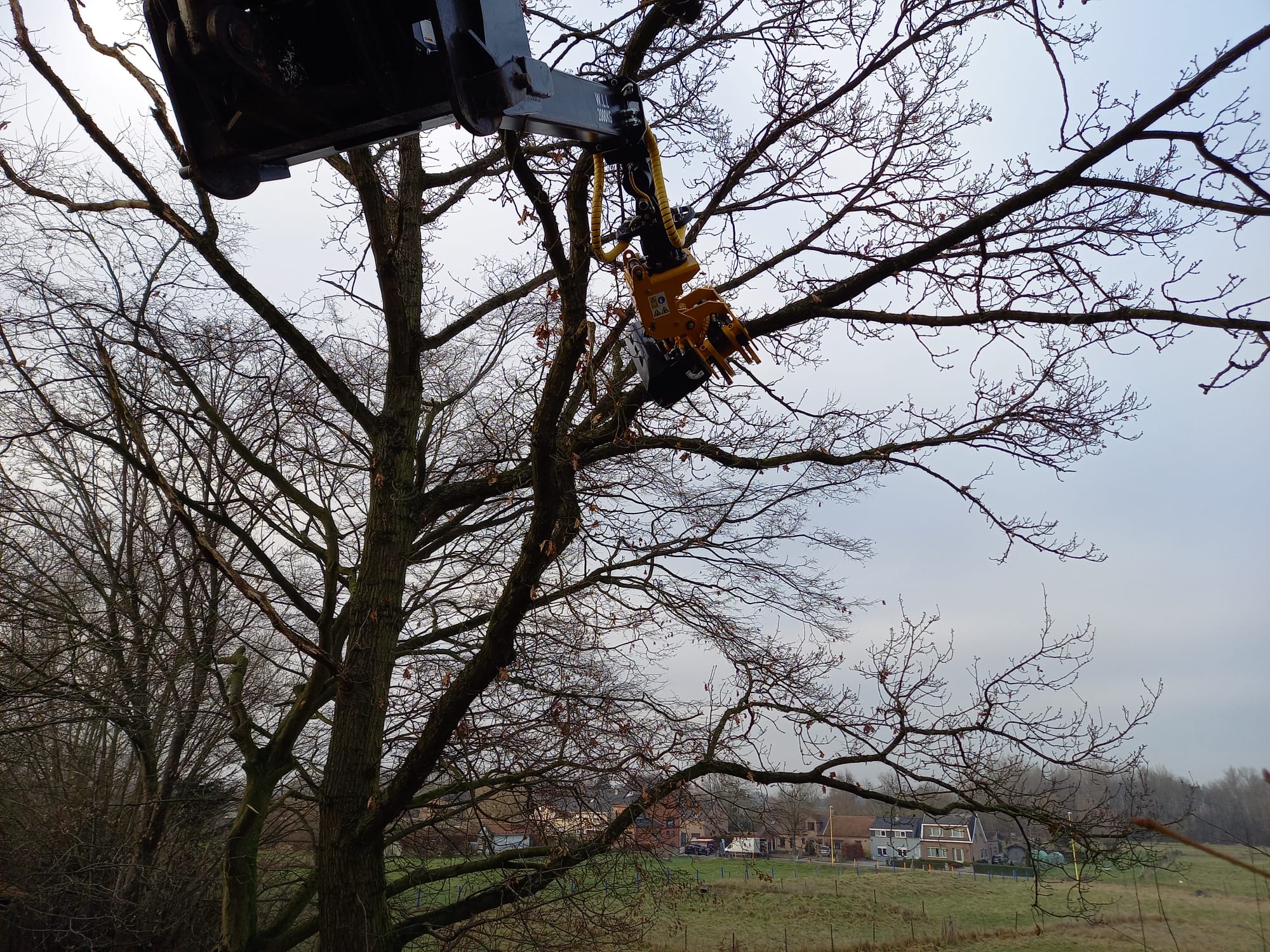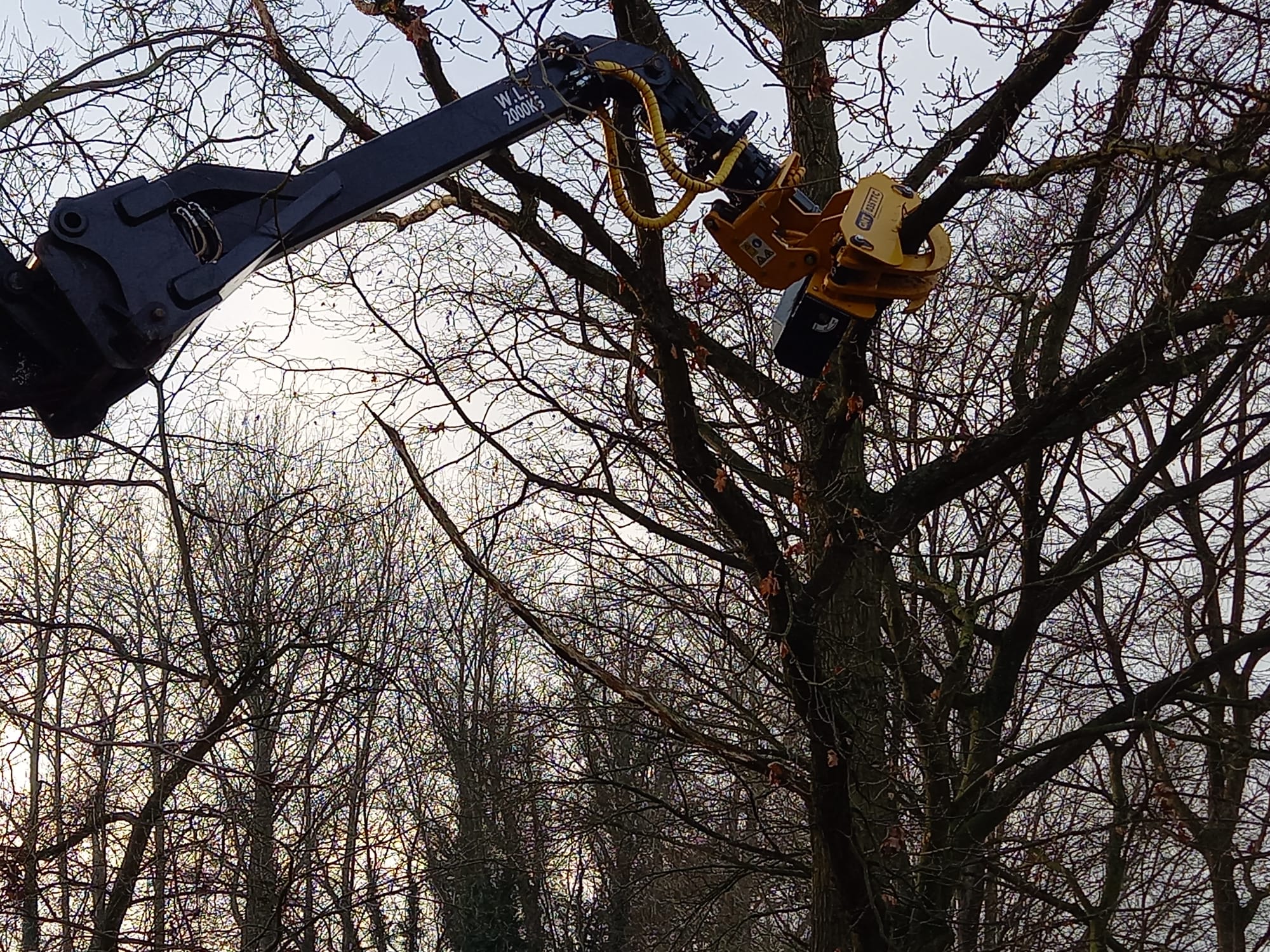 Het vellen van een hoge boom is geen alledaagse klus. Hiervoor doet u het best een beroep op een expert als JEVEBO. Onze VERREIKER met ROTERENDE VELKOP (houtklem met zaagfunctie) laat ons toe om op grote hoogte takken of boomstammen af te zagen. De zware houtklem zorgt er op haar beurt voor dat de boomdelen veilig en gecontroleerd naar de grond gebracht kunnen worden.